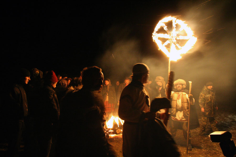 В конце празднования был обязательный обычай – сожжение деревянного колеса, символизирующего Солнце, и спускание его вниз с горы.